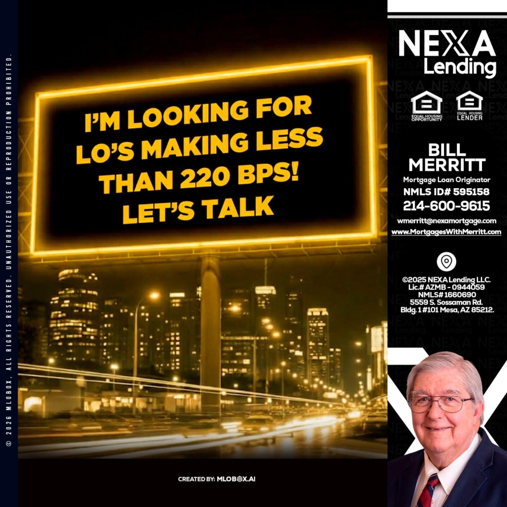 Hi, my name is Bill Merritt. I’m a Loan Officer with NEXA Lending LLC., offering personalized mortgage solutions, fast customized quotes, great rates and service with integrity.