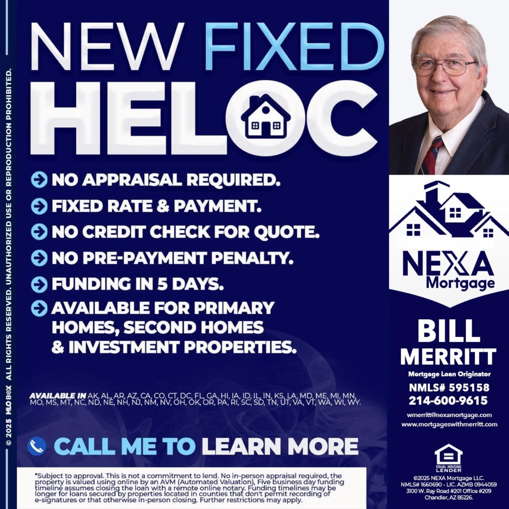 NEW FIXED HELOC - Bill Merritt -Mortgage Loan OriginatorHi, my name is Bill Merritt. I’m a Loan Officer with NEXA Mortgage LLC., offering personalized mortgage solutions, fast customized quotes, great rates and service with integrity.