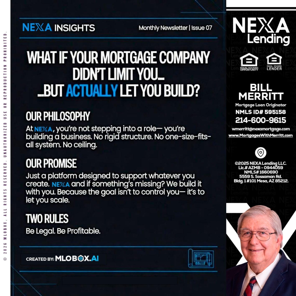 Hi, my name is Bill Merritt. I’m a Loan Officer with NEXA Lending LLC., offering personalized mortgage solutions, fast customized quotes, great rates and service with integrity.
